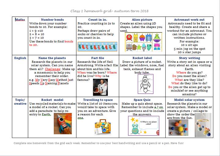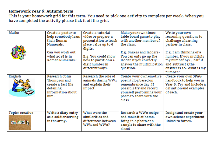 - Grid choice- choose an activity from either English, maths or topic to complete each week